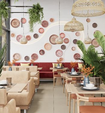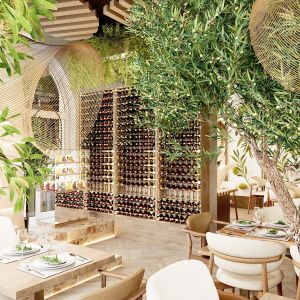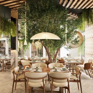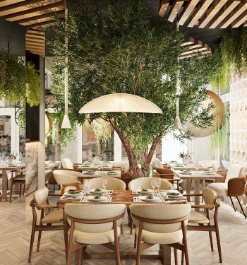 Живые растения, натуральные оттенки и материалы, подвсеной потолочный декор в виде оливок